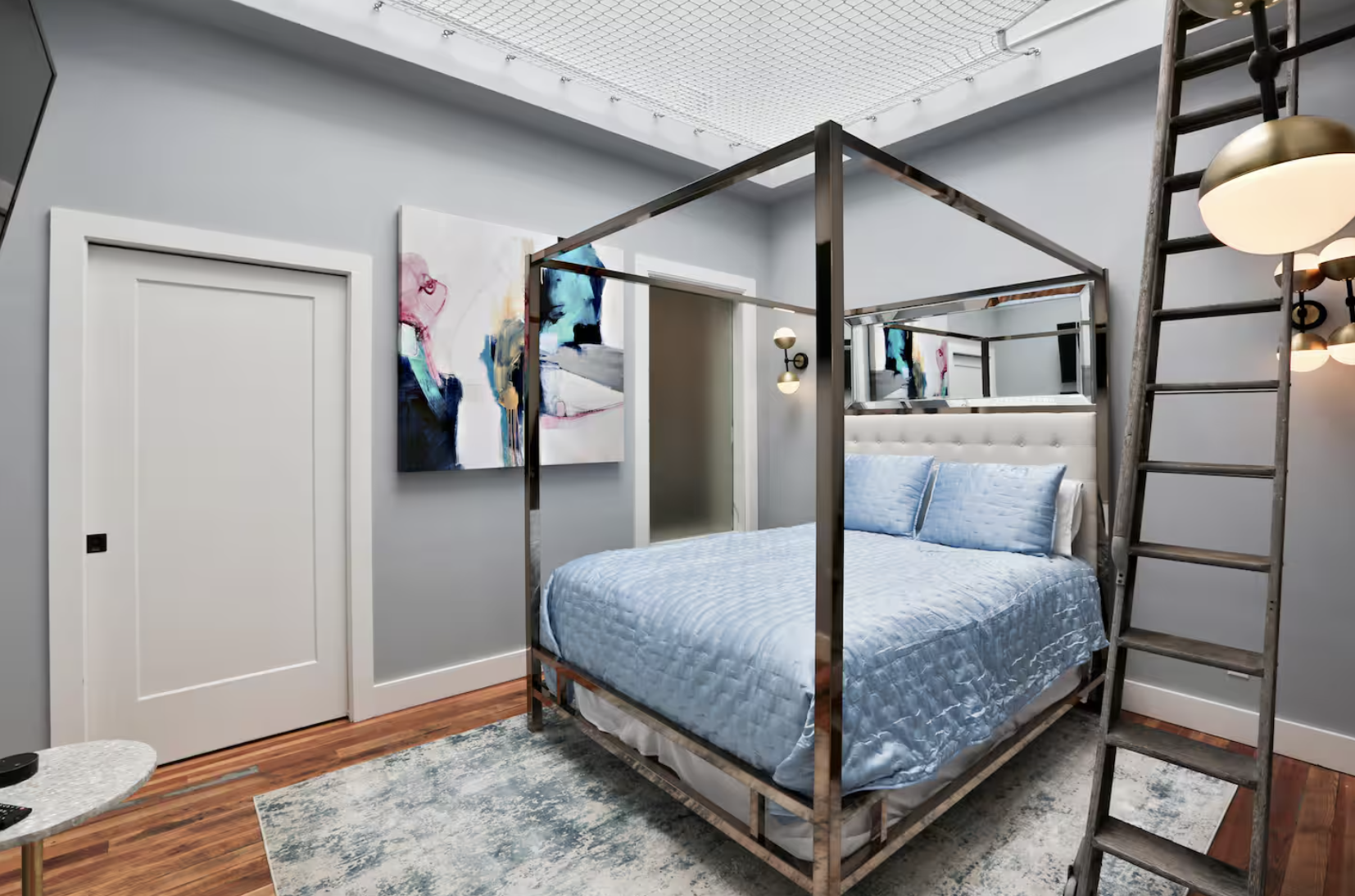 The Queen Suite enchants with a whimsical gold canopy bed that feels both romantic and refined. Overhead, a large skylight and a netted catamaran loft invite guests to climb up, lay back, and stargaze in quiet wonder. A Smart TV offers modern convenience, while the lavish ensuite bathroom features a double vanity, a spacious rain shower with a built-in bench, and a private water closet—every detail curated for comfort, beauty, and a touch of indulgence.